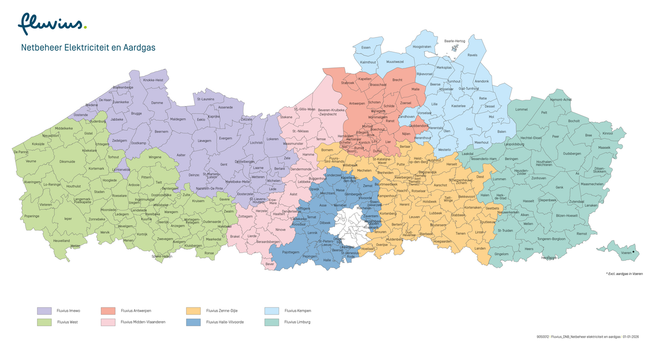 - 8 associations act as distribution system operators (DSOs) for the fully regulated business of electricity and/or natural gas distribution: Fluvius Antwerpen, Fluvius Limburg, Fluvius West, Fluvius Kempen, Fluvius Imewo, Fluvius Midden-Vlaanderen, Fluvius Zenne-Dijle en Fluvius Halle-Vilvoorde. They are also responsible for the heating activity.